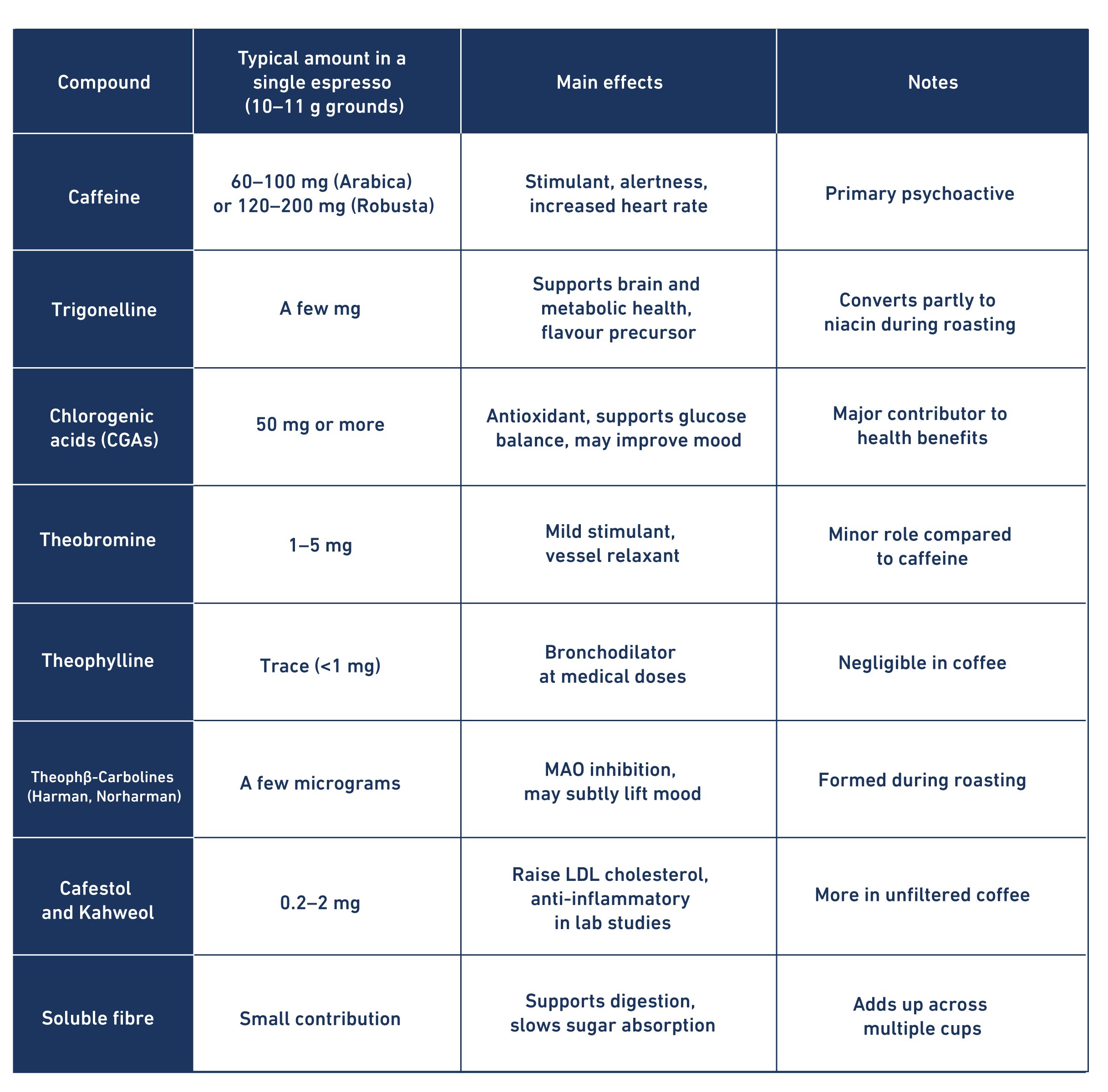 Coffee is not only about caffeine. Every shot of espresso contains a complex mixture of compounds that shape both taste and effect. From trigonelline and chlorogenic acids to cafestol, fibre, and even tiny amounts of β-carbolines, the chemistry of coffee is rich and varied.