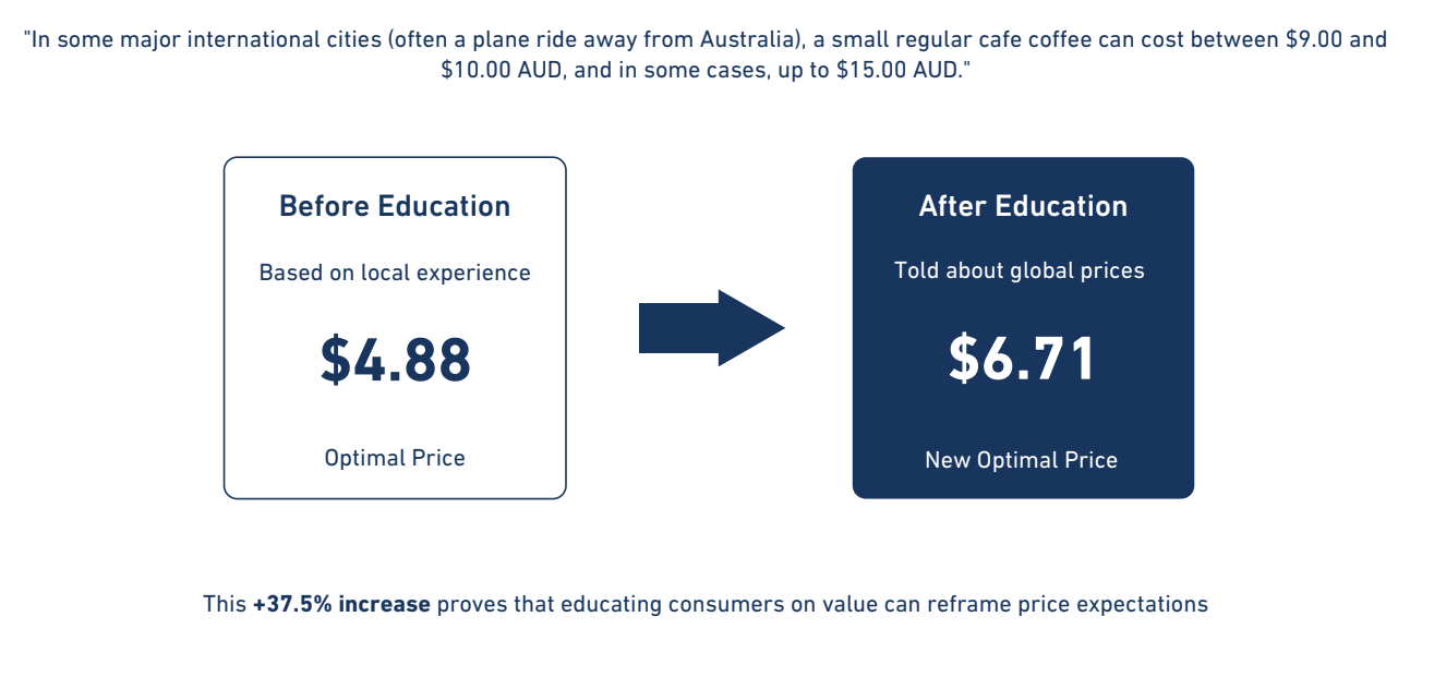 Most customers are unaware of how low the prices in Australia are compared to global cities. Many assume coffee costs the same in most OECD countries. One of the most powerful findings came from a single line of context. When respondents were told that in many comparable international cities a small coffee costs between $9 and $10, willingness to pay shifted sharply.
