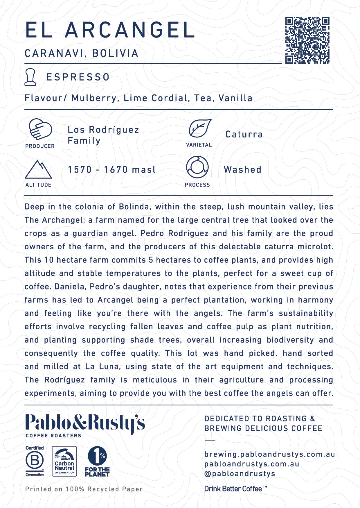 This lot was hand picked, hand sorted and milled at La Luna, using state of the art equipment and techniques. The Rodríguez family is meticulous in their agriculture and processing experiments, aiming to provide you the best coffee the angels can offer.