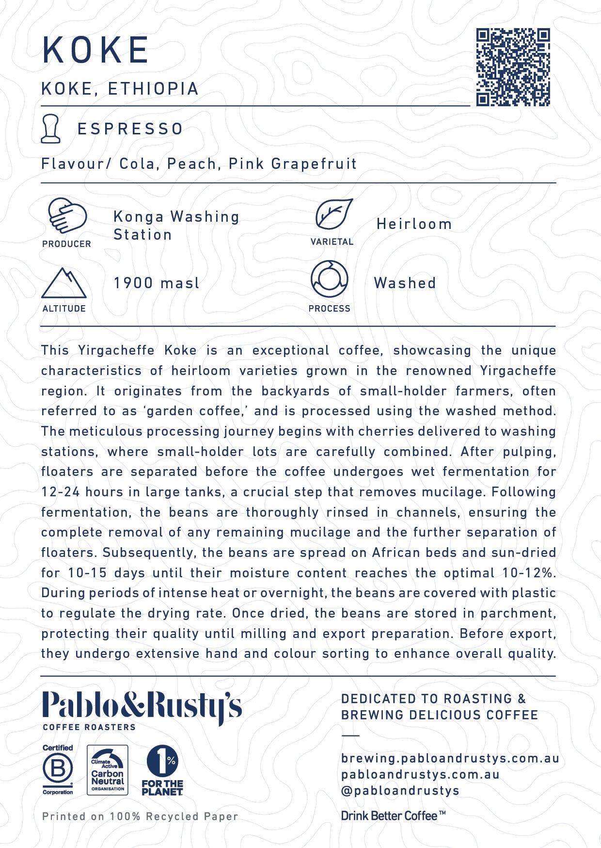 This Yirgacheffe Koke is an exceptional coffee, showcasing the unique characteristics of heirloom varieties grown in the renowned Yirgacheffe region. It originates from the backyards of small-holder farmers, often referred to as 'garden coffee,' and is processed using the washed method.