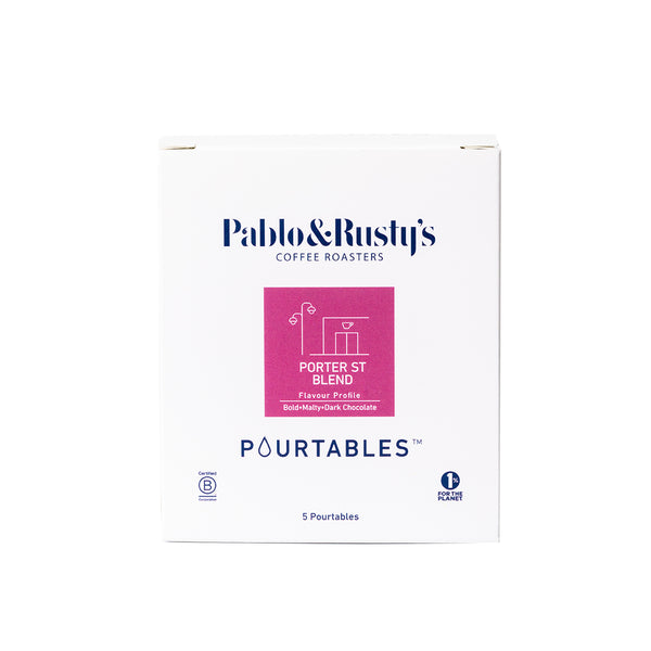 Our Pourtables packs are most similar to a pour-over brew method (Pour + Portable Coffee = Pourtables. Get it?). But because we care about your brew, we’ve done the grinding and weighing for you. We’ve added 11g of specialty ground coffee to each sachet, which can be easily placed onto your favourite mug or cup and brewed. We also nitrogen-flush the sachets, then seal them up so they can be enjoyed for up to 18 months!