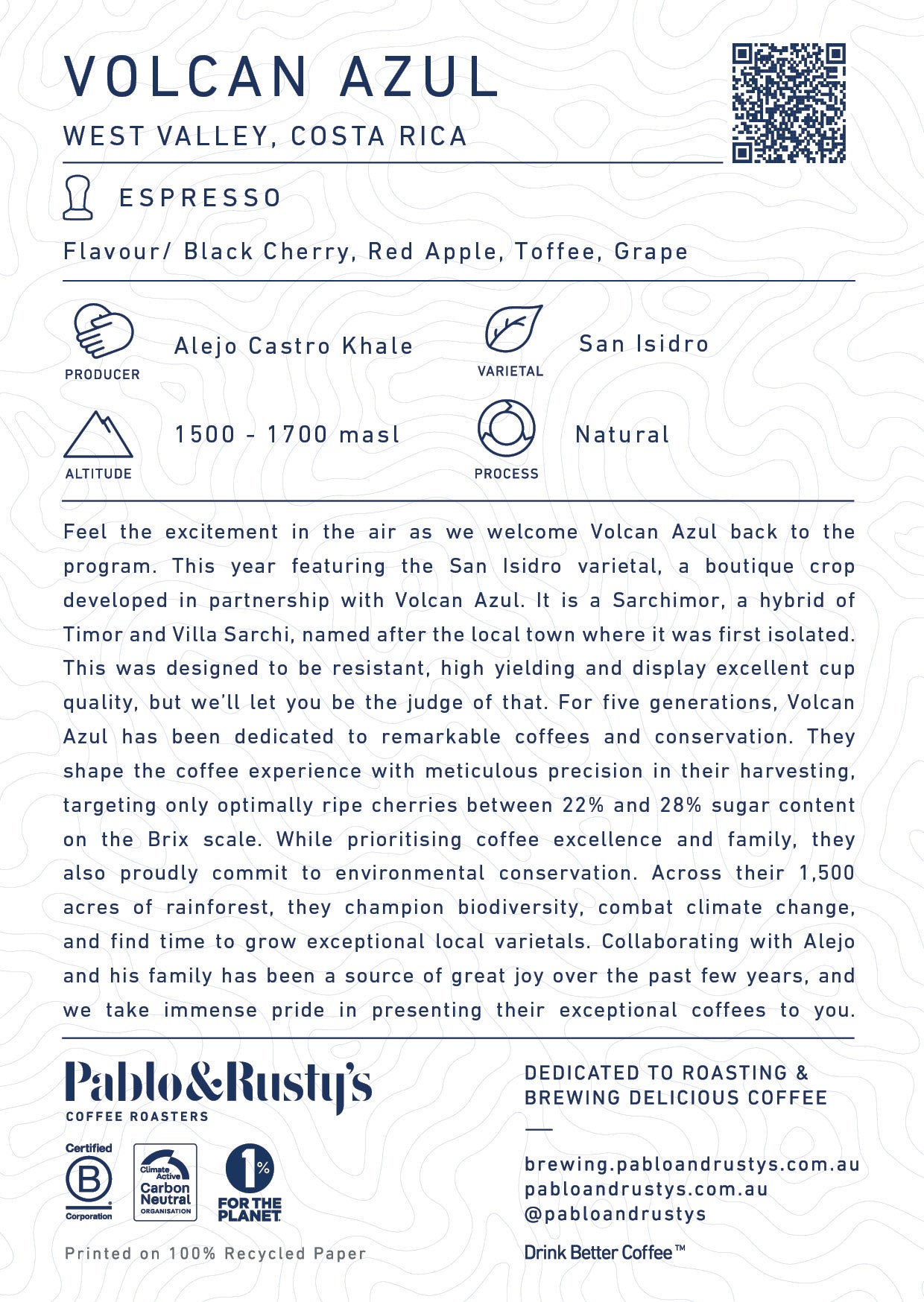 Feel the excitement in the air as we welcome Volcan Azul back to the program. This year featuring the San Isidro varietal, a boutique crop developed in partnership with Volcan Azul. It is a Sarchimor, a hybrid of Timor and Villa Sarchi, named after the local town where it was first isolated. This was designed to be resistant, high yielding and display excellent cup quality, but we’ll let you be the judge of that.